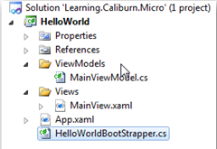 First, lets edit the HelloWorldBootStrapper class. Make the class public, if it is not already, then derive it from Bootstrapper<MainViewModel>. You will need using statements to