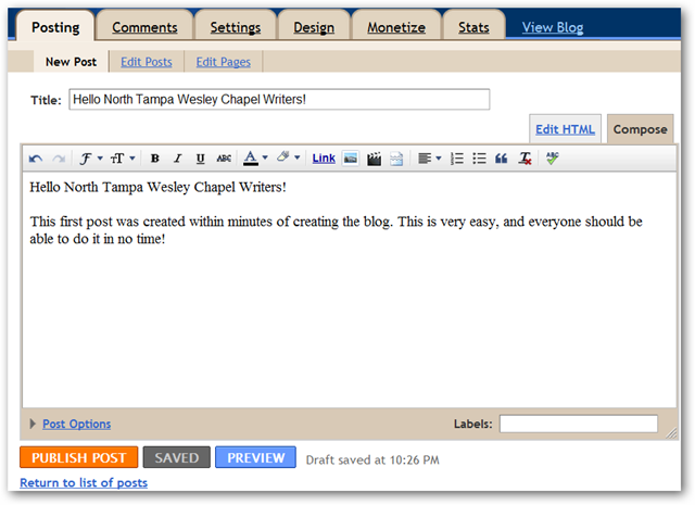 Now we add our first post. Blogger has a web based editor to let you write and format your posts. As you can see it is similar to many word processors, and has a tool bar at the top. For now, I would ignore using the Edit HTML option unless you are comfortable with working with HTML. You should be able to write any of your posts, include links, add pictures or video, and most importantly do your editing in this window.