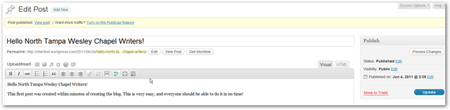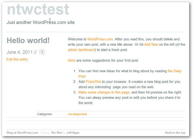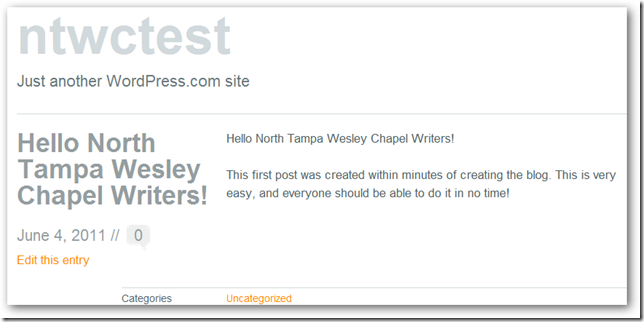 Now if you go to http://ntwctest.wordpress.com/ you will see our first new post.