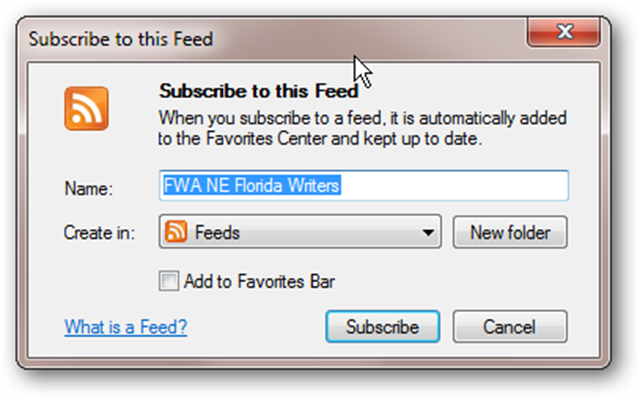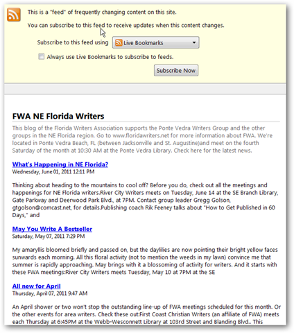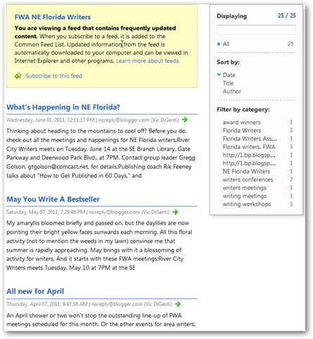 The above is telling you the title of blog (FWA NE Florida Writers), how many posts are displayed and available (25/25), how many are in each of a list of categories, and an excerpt from the first three blog posts. You can also click the Subscribe to this feed link, and this will pop up a window that allows you to create a special bookmark that Internet Explorer knows to treat as a blog subscription.