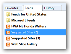 Clicking on View my feeds will show you the collection of feeds. Here you can see that Internet Explorer has four feeds and two folders (that also contain feeds). You will notice there is no number next to FWA NE Florida Writers. That means that no new posts have been made since the last time we loaded the page or added the subscription. The number would tell you the number of new posts since last you read that blog. Now you know how to quickly identify the blogs with new content.