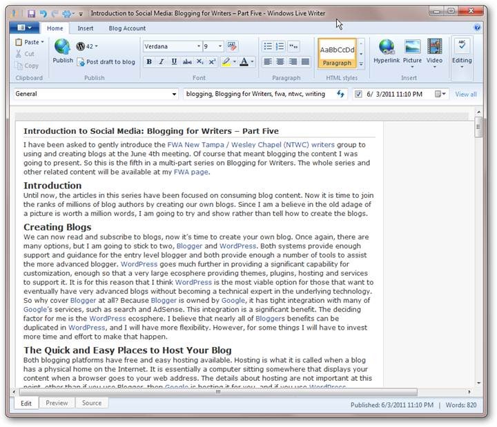 The interface should be familiar to anyone used to Word or most modern word processors. What I like about Windows Live Writer (WLW) is that I can edit, preview, and even get into the source very easily (just like on the web site), but I have the same commands and keystrokes I am used to from other applications. I also like that I can work on multiple drafts and save them locally. I also like that I can use the same tool to work with many different blogs. Finally, I admit, I love the word count in the bottom right corner. There is a perverse kind of thrill to looking up after some time writing and seeing a high three digit or a four digit number down there.