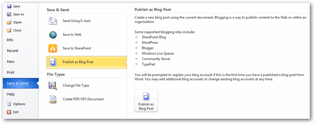 As you can see, Word can publish to WordPress and [ Blogger , plus a number of other blogging frameworks. If you choose this option, please share your experience with me. I am too set in my writing ways to want to try it at this time.