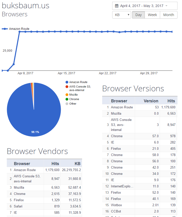 Finally, I like to know what browsers people are using to read my blog. Or in this months case, watching how Amazon's CDN skewed all my results.
