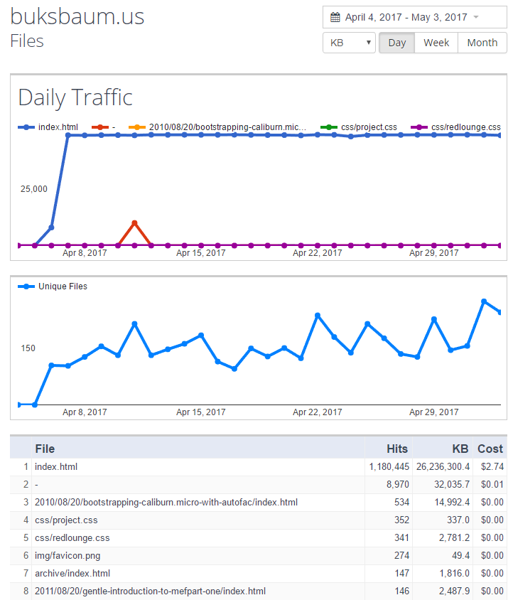 in a months time to determine how much this blog post is actually costing me. That's a level of detail I never had before - a cost estimate per page. That information is on the Files tab - with the top 10 costing files on the Overview tab. As I said - the core information I want all in one place.